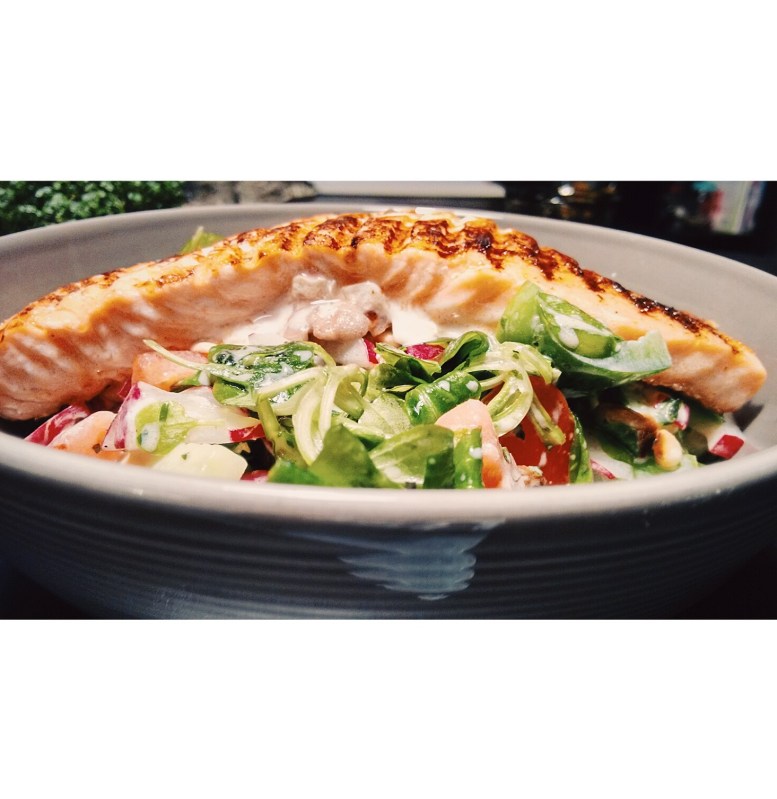 9. Leg de gebakken zalm op de salade in de 2 diepe borden.