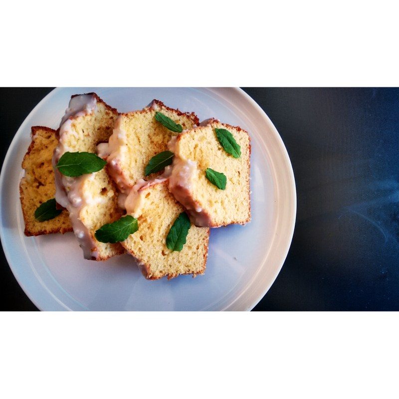8. Roer de poedersuiker met het citroensap tot glazuur. Smeer of giet het glazuur over de cake en garneer met muntblaadjes.
