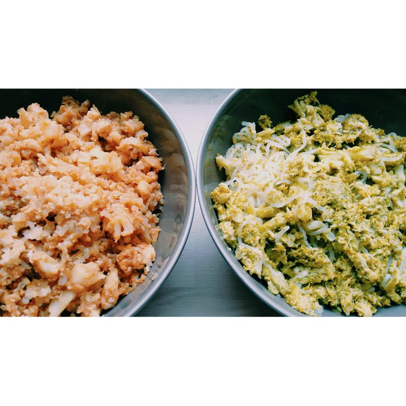 4. Snijd de bloemkool en de broccoli in de kom in zeer fijne stukjes tot je een soort gehakt krijgt van de groenten.