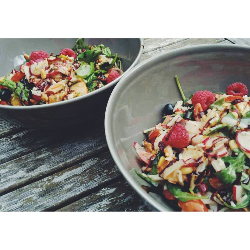 4. Verdeel de rucola salade in twee diepe borden. Verdeel er de radijzen, de snoeptomaatjes, de basilicumblaadjes, de frambozen en de blauwe bessen in.