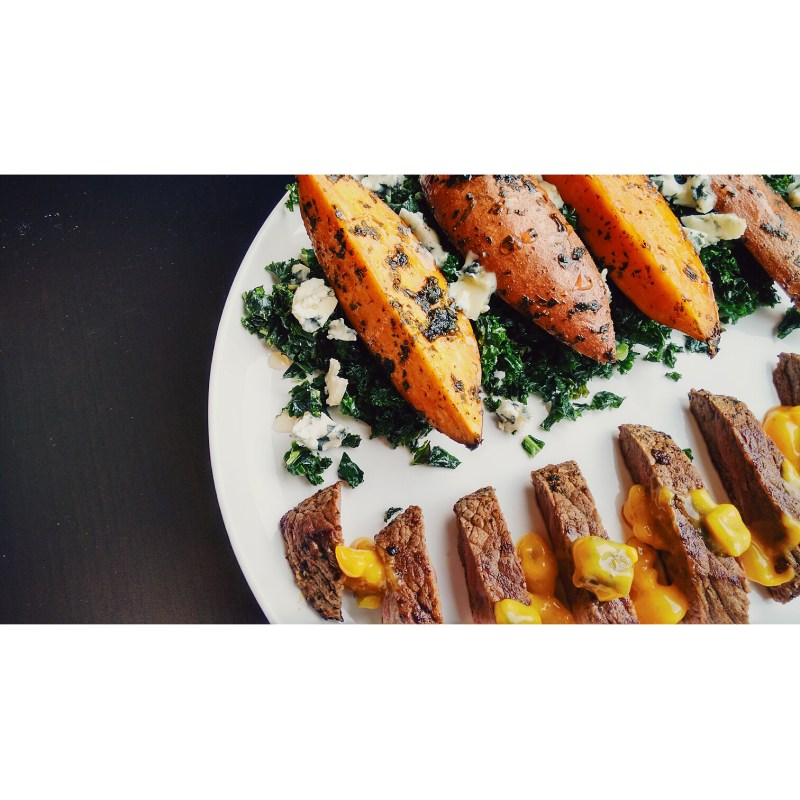 7. Verhit een kookpot met 1 eetlepel olijfolie en stoof er gedurende 5 minuten de boerenkool in. Af en toe roeren zodat de boerenkool niet uitdroogt en lekker crunchy blijft in samenspraak met de olijfolie. Kruid dit af met een beetje peper en zout. Leg de gestoofde boerenkool op het bord en leg er een paar stukken zoete aardappel op. Brokkel hierover enkele stukjes gorgonzola en werk nogmaals af met een scheut honing.