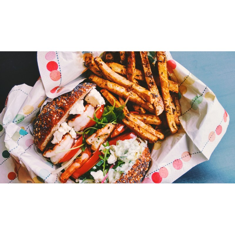 8. Neem de speltbollen uit de oven en leg het onderste deel op een bord. Smeer hierop 2 eetlepels tzatziki, leg er de babyspinazie, schijfjes komkommer en tomaat op en vervolgens een paar reuzen garnalen met de verbrokkelde fetakaas. Herhaal dit proces en leg er de bovenkant van de speltbol op.