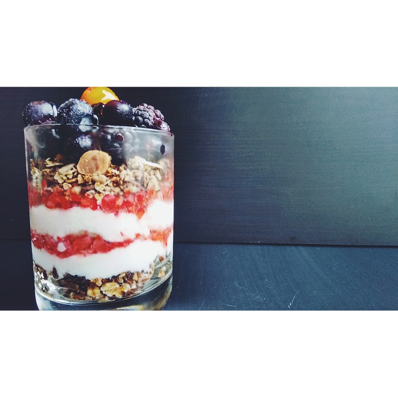 Maar eerst een stevig, vullend en gezond ontbijt! Ready?! 1, 2, trifle! De Griekse yoghurt zorgt voor de eiwitten, de granola voor de dosis traag opnemende koolhydraten en het fruit voor de vitamientjes! Voldaan gevoel zonder volle buik!