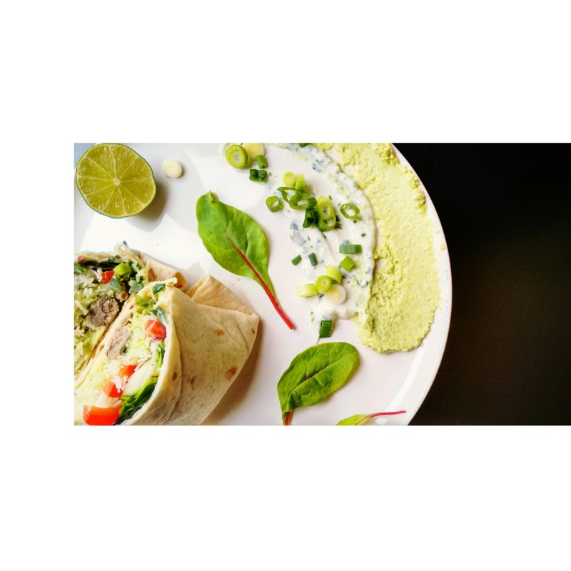 8. Leg een wrap op een bord en verwarm deze gedurende 30 seconden in de microgolfoven. Vul het middelste deel van de wrap met de verschillende ingrediënten naar jouw wens en vouw deze langs beide zijden toe. Vouw dit nog eens langs beide zijden toe en snij de gevouwen wrap doormidden. Serveer met extra guacamole om te doppen en een eventueel extra schijfje limoen voor een pittige toets.