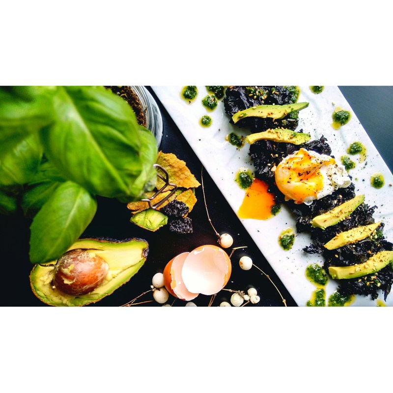 6. Leg de gebakken paarse boerenkool op een bord. Leg daarop de stukjes avocado en strooi er de geroosterde sesamzaadjes over. Leg het gepocheerd ei in het midden van het geheel en maak er met een scherp mesje enkele kervingen in zodat het eigeel er kan uitvloeien. Kruid het geheel goed af met zwarte peper en grof zeezout en werk af met de basilicumdressing.