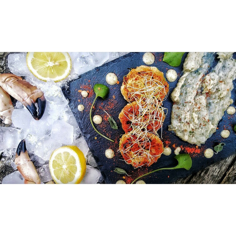 7. Serveer de crabcakes met de puree en de aioli samen met garnituur naar eigen smaak. Ik heb hier gekozen voor preischeuten en postelein.