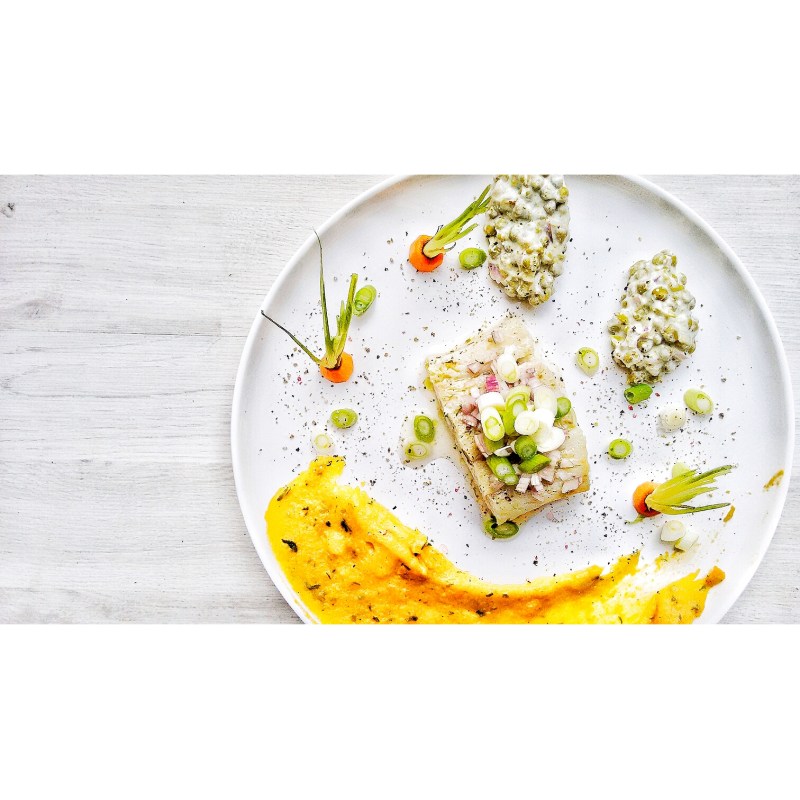 5. Smeer de puree op een bord en leg er een stuk gebakken koolvis naast. Leg hierop een paar snippers sjalot en ringetjes gesneden lente ui. Lepel er tenslotte de doperwten bij en kruid het bord nog eens af met zwarte peper.