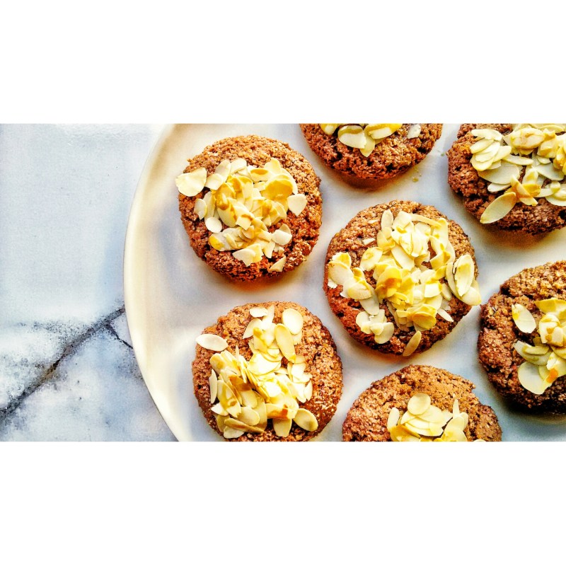 5. Haal de koekjes uit de oven en giet op elk koekje een beetje honing, amandelschilfers en weer wat honing. Bak ze daarna nog vijf minuten in de oven.