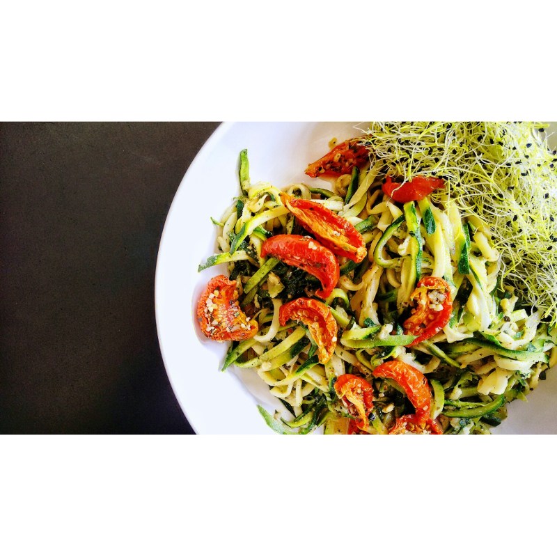 3. Leg de gewokte courgetti in een diep bord en leg er zongedroogde tomaatjes en een bosje preischeuten bij.