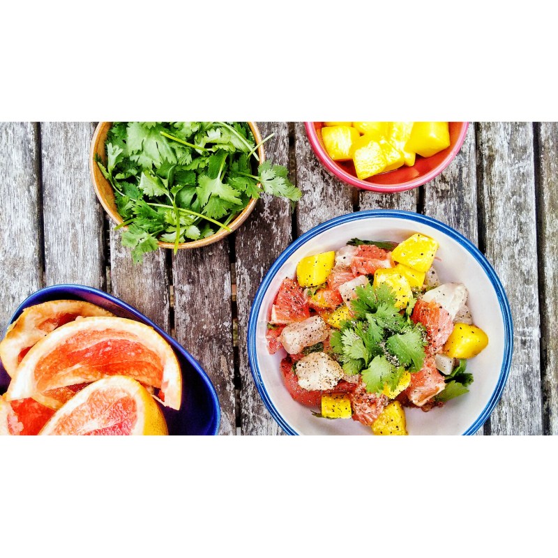 4. Doe de stukjes mango, pompelmoes en tonijn in een kom en doe er een handjevol koriander bij. Giet hierover een flinke scheut arachideolie en kruid alles af met zwarte peper en grof zeezout. Roer dit goed door elkaar en klaar!