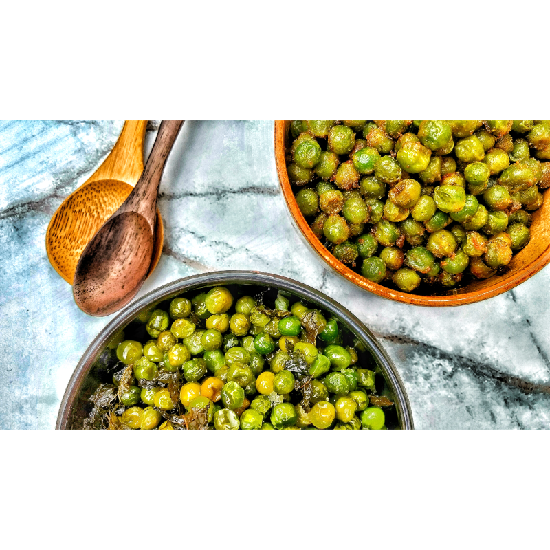 4. Verdeel de bewerkte erwten op een vel bakpapier op twee bakplaten en rooster ze gedurende 40 minuten op 180°