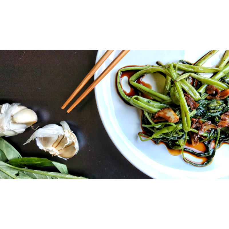 1. Verhit een wokpan met een scheut arachideolie en leg er de waterspinazie, een doormidden gesneden chilipeper en de geplette tenen look in. Laat dit op een laag vuurtje gedurende een paar minuten afgedekt sudderen.