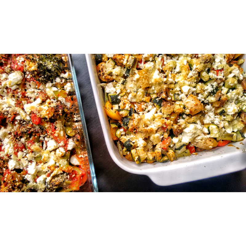 Snij de paprika’s, de courgette en de kipfilets in stukjes. Doe deze in een schaal en overgiet het met olijfolie. Kruid goed af met peper, zout, kippenkruiden, paprikakruiden, Italiaanse kruiden en ProvenƧaalse kruiden. Roer alles goed onder elkaar, werk af met stukjes fetakaas en bak de schotel in een voorverwarmde oven gedurende 50 minuten op 180°.