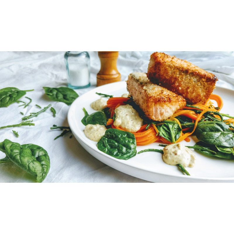 1. Snij de zalmfilets in stukken, kruid ze af met peper en viskruiden met dille, dop ze in arachideolie en daarna in kokosschaafsel.
