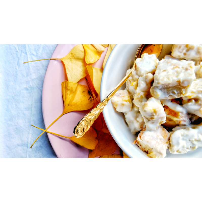 Snij de gebakken cake in stukjes.Ā Meng het blik kokosmelk met de andere helft yoghurt en een beetje zoetstof. Meng dit onder de stukjes cake en klaar!