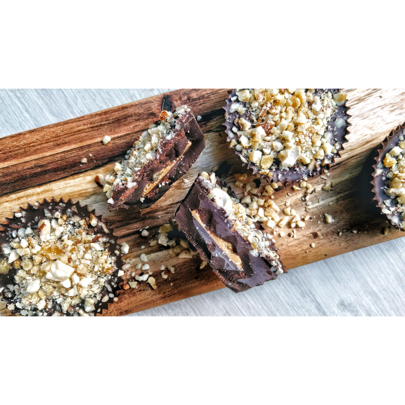 Leg papieren cupcake vormpjes in een metalen of ijzeren cupcake vorm. Smelt de helft van de chocolade au bain marie, verdeel deze in de vormpjes en zet deze een kwartier in de diepvries. Mix de pindanoten met twee eetlepels arachideolie en een snufje zout in een keukenrobot. Smelt de andere helft chocolade au bain marie en neem de opgesteven bodempjes uit de diepvries. Leg in het midden van de bodempjes een lepel pindakaas en giet daarover de gesmolten chocolade tot de pindakaas niet meer zichtbaar is. Strooi hierover wat gecrunchte gemengde noten en laat ze nog een kwartier in de diepvries opstijven.