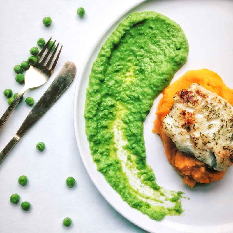 Bak de kabeljauwfilets in een scheutje olijfolie en kruid ze af met peper en viskruiden met dille. Lepel de erwtenspread met een veeg op het bord, serveer er de pompoenpuree bij en leg daar de kabeljauwfilet op.