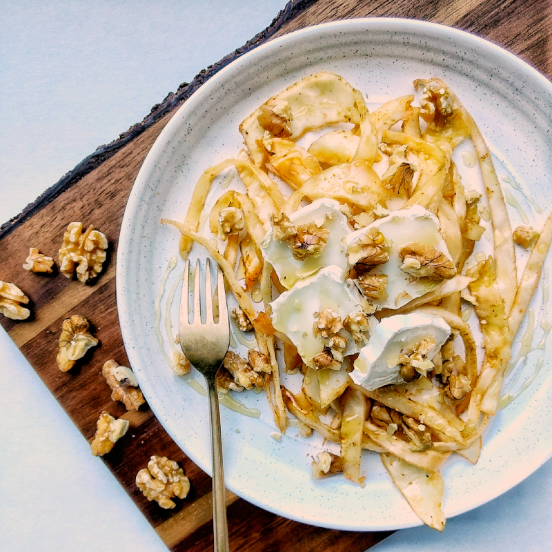 Snij de kool in slierten en roerbak ze in een wok gedurende een paar minuutjes met een scheut olijfolie, pikante kippenkruiden en peper. Serveer ze op een bord en leg er een paar schijfjes geitenkaas op. Zet dit twee minuutjes in de microgolfoven zodat de geitenkaas smelt en werk af met gecrunchte walnoten en honing.