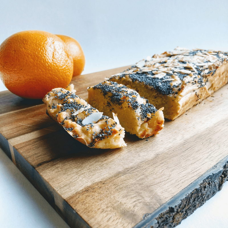 Doe het bakmeel, de yoghurt, de kokosolie, de eieren, het sap en de geraspte schil van de sinaasappels, een snufje zout, en een scheut zoetstof in een kom en meng alles goed onder elkaar tot een beslag. Lepel het beslag in een bakvorm bedekt met bakpapier en zet dit in een voorverwarmde oven gedurende 40 minuten op 180°. Giet de laatste tien minuten van het bakproces wat honing over de cake en bestrooi dit met maanzaad en amandelschilfers.