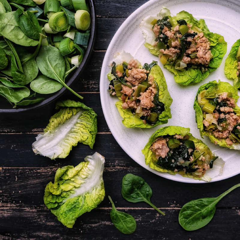 Meng de gewokte groenten met het gehakt en serveer in de crunchy schaaltjes van de Romeinse sla.
