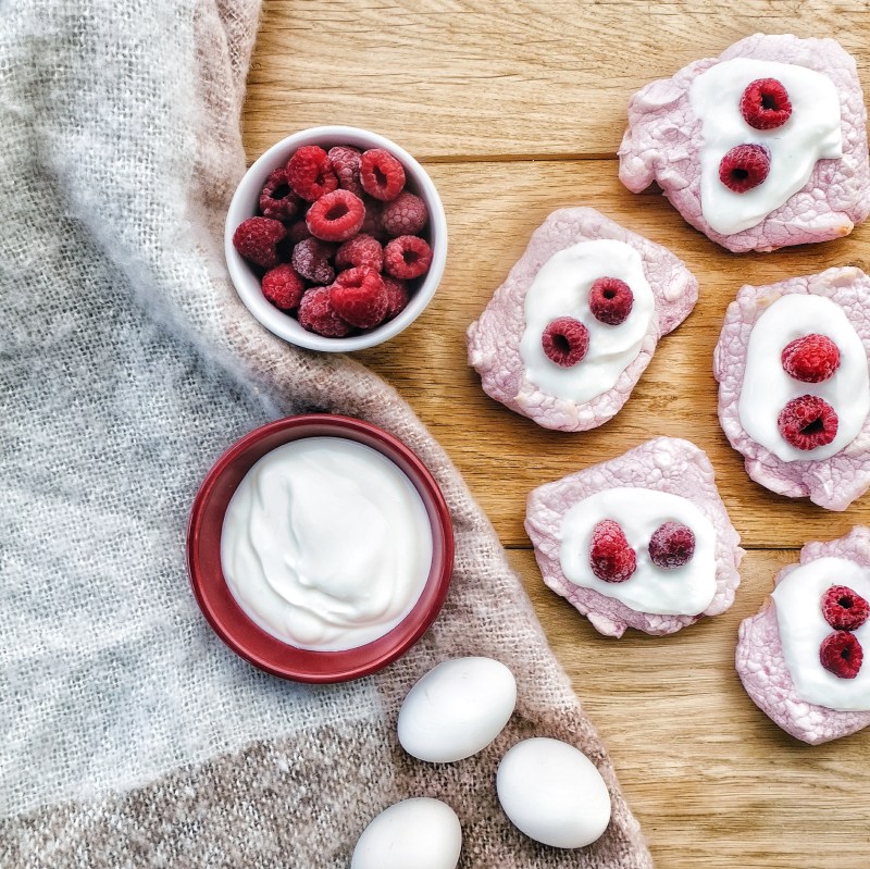 Doe de eiwitten in een hoge maatbeker samen met het sap van één limoen en een scheut zoetstof. Mix 100 gram van de frambozen in een keukenrobot tot coulis. Klop het eiwit stijf en giet er de frambozencoulis bij. Klop nogmaals gedurende een paar seconden. Verdeel het geheel in toefjes op een vel bakpapier op een bakplaat en bak ze in een voorverwarmde oven gedurende 15 minuten op 180°. Haal de toefjes van het vel bakpapier, lepel er wat yoghurt en frambozen op en werk af met honing.
