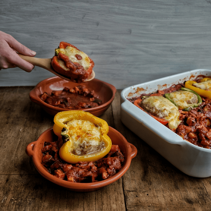 Doe het kalkoengehakt in een mengkom samen met twee tenen geperste look, pikante kippenkruiden, pikante paprikakruiden en peper. Kneed de ingrediënten goed door mekaar. Snij de paprika’s doormidden en verwijder de zaadlijstjes. Vul de paprika’s met het gehakt en nestel ze in de saus. Verscheur de mozzarella over de paprika’s, giet er nog een beetje olijfolie over en werk af met extra pikante paprikakruiden. Bak het geheel in een voorverwarmde oven gedurende 50 minuten op 180°.