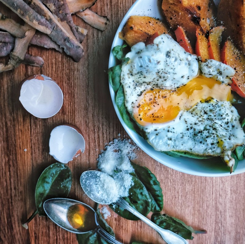 Verhit een pan met een beetje olijfolie en bak er kort de zoete aardappels op, afgekruid met zwarte peper en zout. Serveer ze in een schaal op een bedje zurkel samen met de schijfjes geroosterde kaki. Bak op dezelfde pan twee spiegeleieren en leg ze op de ingrediënten. Werk af met honing, Parmezaan, zwarte peper en zout.