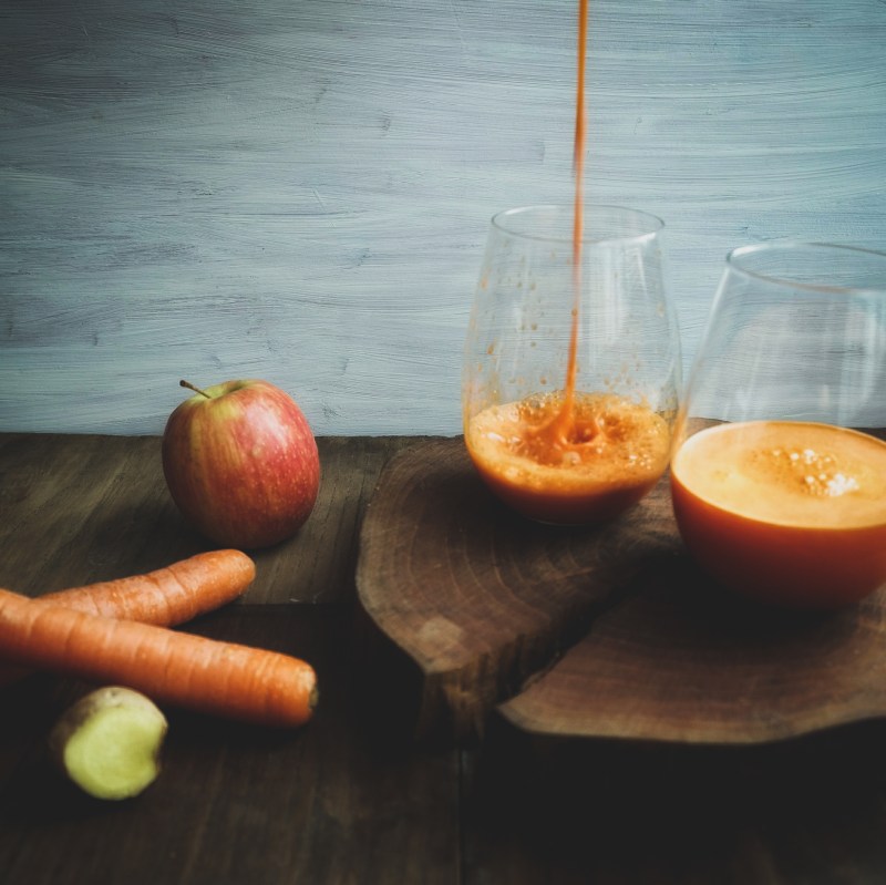 Verwijder de topjes van de wortels en snij het klokhuis van de appel. Doe de wortels, de stukken appel en het stuk gember één voor één in de sapcentrifuge en serveer in glaasjes.