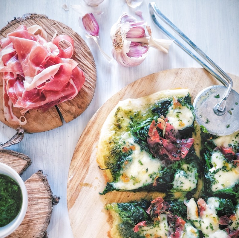 Druk de bol deeg met je handen plat op een vel bakpapier op een bakplaat en verdeel er met een lepel de pesto over. Leg hierop de gewokte spinaziebladeren, scheur er de sneden Serranoham en mozzarella over, giet er een scheutje olijfolie over en strooi hier en daar wat Provençaalse kruiden. Bak de pizza gedurende 15 minuten in een voorverwarmde oven op 275°. Heeft je oven niet zo’n hoge temperatuur? Bak hem dan iets langer. Hoe hoger de temperatuur, hoe krokanter het deeg.