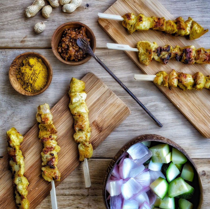 Snij de kip in kleine blokjes en marineer ze in zonnebloemolie. Voeg hierbij één eetlepel kurkuma, één eetlepel geel kerriepoeder, zout en peper toe. Meng goed onder mekaar en steek de blokjes kip op stokjes. Bak de satés op een grillpan gedurende een paar minuutjes. Zeker niet te lang, zodat de kip mals en sappig blijft.