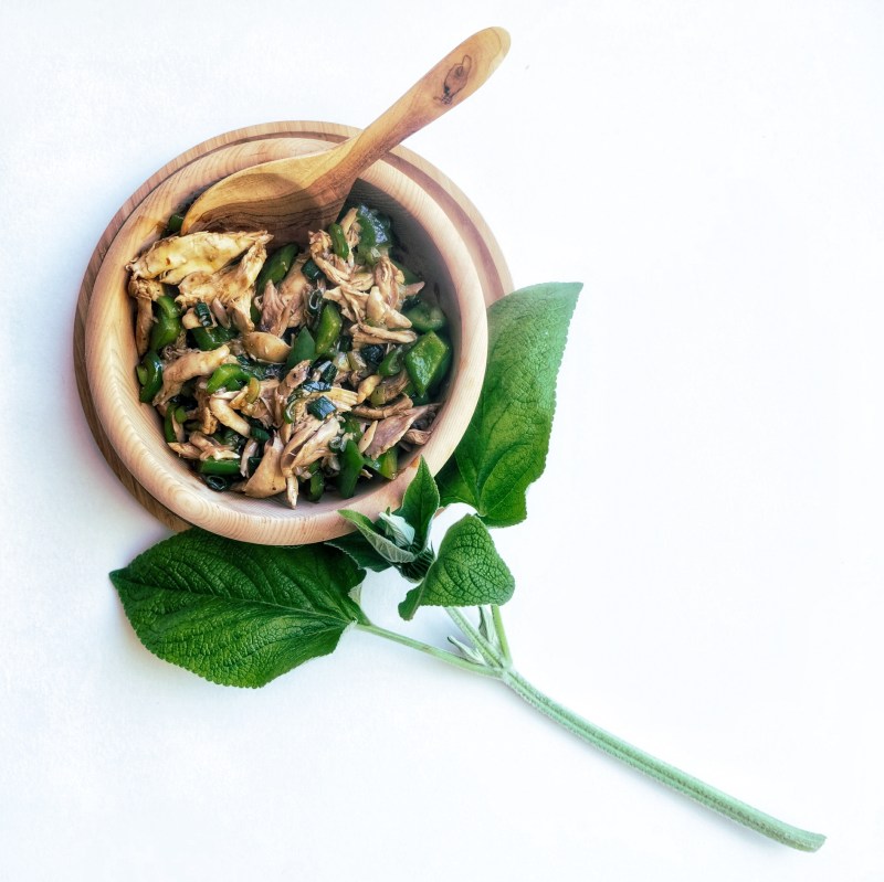 Verhit een wokpan met een flinke scheut olijfolie en roerbak er de paprika en de lente ui in gedurende vijf minuutjes, voeg daarna de pulled chicken toe en een flinke scheut oestersaus. Kruid af met zwarte peper, zout en pikante kippenkruiden en laat alles goed door elkaar sudderen. Serveer eventueel met rijst, couscous of quinoa. Smakelijk!