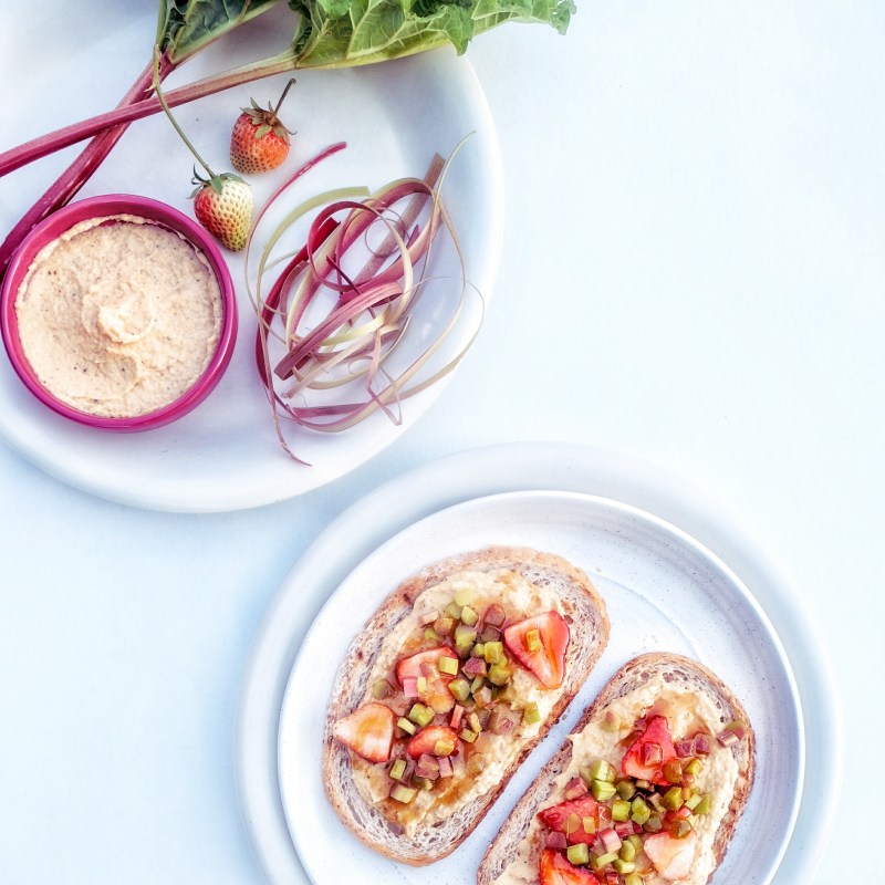 Schil de rabarber en snij hem zeer fijn in stukjes. Snij de aardbeien in schijfjes. Toast het brood, smeer er de hummus op, leg er de rabarber en de aardbeien op en werk af met honing. Zeer simpel maar echt zo lekker, gezond en vullend want kikkererwten zitten boordevol eiwitten!