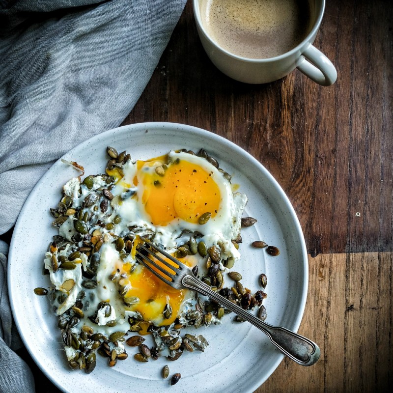 Verhit een pan en giet er een scheut maĆÆsolie op. Doe er naar wens een hoeveelheid pompoenpitten op en bak ze goudbruin. Breek er daarna de eieren over en kruid af met zwarte peper en zout. Bak het geheel nog een paar minuutjes en klaar!