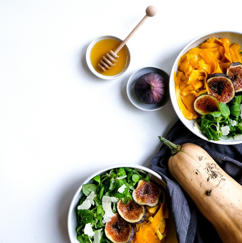 Serveer de gewokte pompoen in twee diepe borden met een paar schijfjes verse vijg, wat sla, dikke schilfers Parmezaanse kaas en werk af met nog een scheutje olijfolie, honing en zwarte peper.