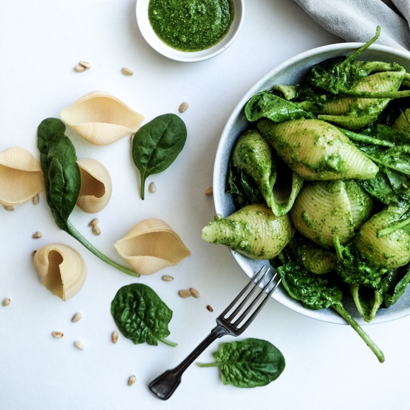 Doe een handjevol bladspinazie, twee tenen gepelde look, de helft van het zakje Parmezaanse kaas, een handjevol geroosterde pijnboompitten, een flinke scheut olijfolie, zwarte peper en zout in een hakmolen of keukenrobot en mix op de hoogste stand tot pesto. Is de pesto nog te dik? Voeg dan wat extra olijfolie toe. Kook de pastaschelpen gedurende 15 à 20 minuutjes al dente en giet ze af in een vergiet. Doe ze terug in de kookpot maar zet deze niet meer op het vuur. Voeg hierbij de pesto en twee handjes bladspinazie en roer alles voorzichtig onder elkaar. Tadaaa een lekker pastagerecht in no time! Smakelijk!