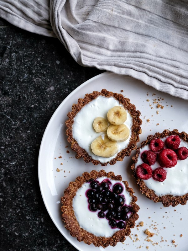 Doe de haver en de zonnebloempitten in een hakmolen of keukenblender en maal dit fijn. Doe dit in een mengkom samen met het amandelmeel, een flinke scheut honing, een flinke scheut druivenpitolie (die zorgt voor de kruidige smaak) en een scheut vloeibare zoetstof. Kneed dit goed door elkaar en vul er de bakvormpjes mee. Druk het deeg goed aan en zorg ervoor dat de bodem en de randen gelijkmatig bedekt zijn. Bak ze in een voorverwarmde oven gedurende 30 minuten op 180°. Laat ze afkoelen, vul ze met de Griekse yoghurt en werk af met fruit.
