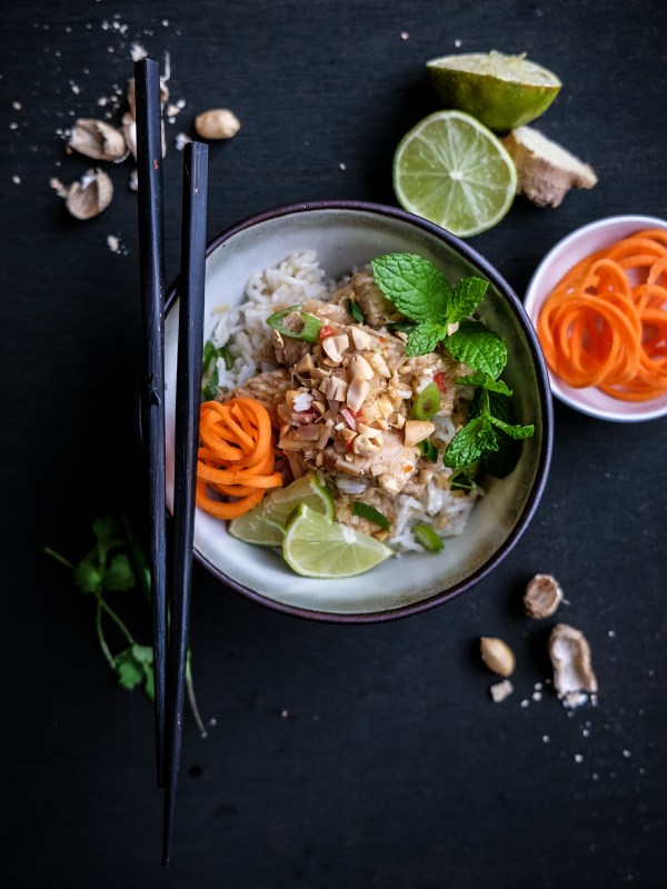 Serveer de rijst, daarover de kip met limoengras en werk af met ringetjes lente ui, gehakte pindanoten, een opgedraaid slingertje wortel en extra limoenschijfjes. Smakelijk!