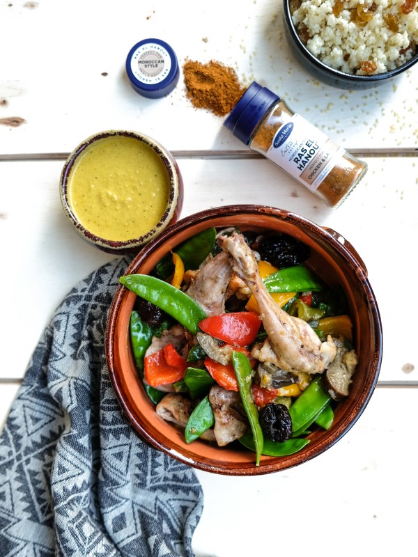 Doe het blik kikkererwten met het sap in een keukenrobot of hakmolen. Doe hierbij twee theelepels ras el hanout, één theelepel citroenpeper, twee theelepels komijn, twee theelepels kurkuma en een flinke scheut arachideolie. Mix dit gedurende één minuutje op de hoogste stand? Dit is de hummus die zal dienen als sausje voor het stoofpotje.