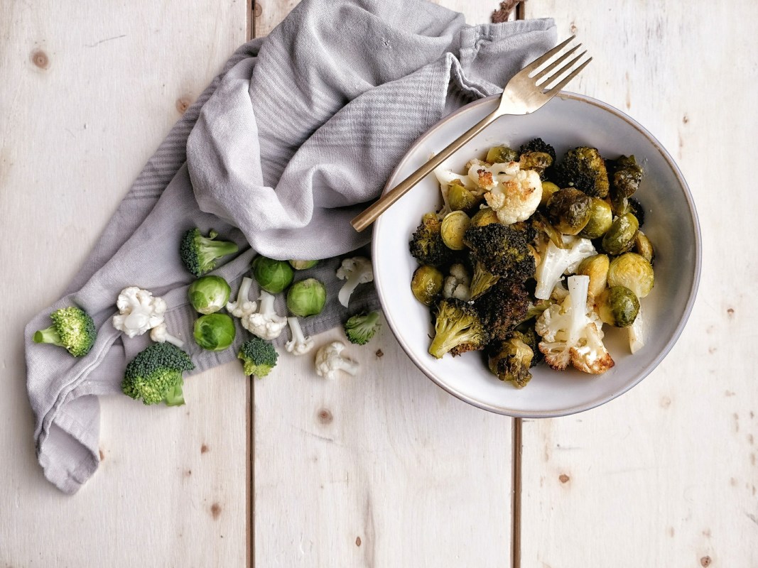 Snij de roosjes van de bloemkool en van de broccoli. Snij de kontjes van de spruitjes en snij ze doormidden. Doe de groenten in een ovenschaal en overgiet ze met flink wat olijfolie. Kruid af met peper en zout en roer alles goed onder elkaar. Rooster de groentjes in een voorverwarmde oven gedurende een uurtje op 180° en klaar! Lekker puur!