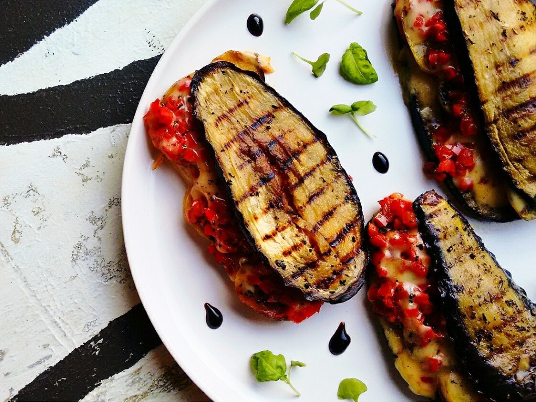 Maak nu de panini’ s waarbij de plakjes aubergine de onder- en bovenkant vormen. Begin met een plakje aubergine, dan leg je er de kaas op, vervolgens de schijfjes gegrilde tomaat, daarna de schijfjes gegrilde aardappel, de stukjes zoete rode puntpaprika, nogmaals de kaas en tenslotte weer een plakje aubergine. Herhaal dit proces voor de andere panini’s.
