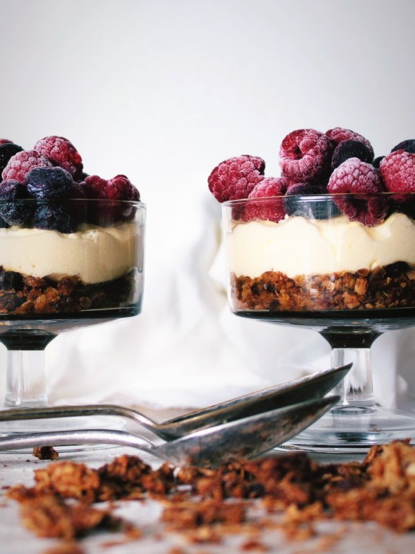 Verdeel de afgekoelde granola over de bodempjes van de glaasjes. Schep hierover de mascarponemousse en zet de glaasjes gedurende een paar uurtjes in de koelkast. Ontdooi de frambozen en de blauwe bessen en versier er de bovenkant mee. Smakelijk!