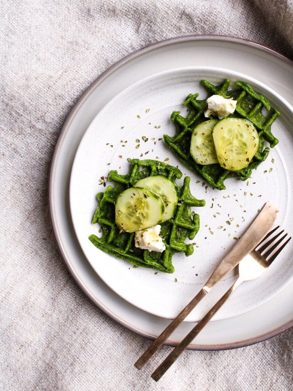 Verhit het wafelijzer en strijk het in met een beetje olijfolie. Bak er de wafeltjes in en kijk regelmatig of ze hun groene kleur behouden. Wanneer ze een beetje bruin beginnen worden, haal je ze er zeker uit. Beleg de gebakken wafeltjes met schijfjes komkommer, verbrokkelde fetakaas, Griekse kruiden en honing. Kali orexi!