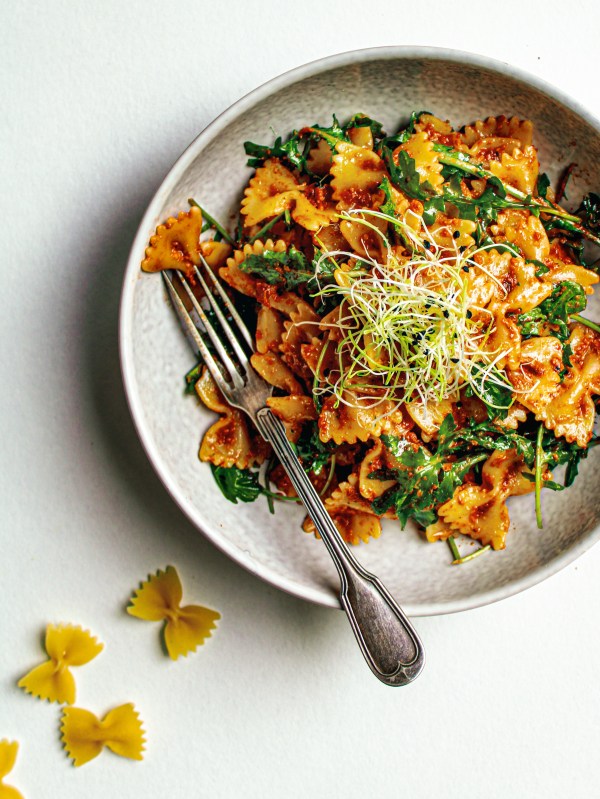 Kook de strikjes al dente, giet ze af en doe ze terug in de kookpot. Doe hierbij de pesto en roer alles goed onder elkaar. Doe er vervolgens de rucola bij en roer nogmaals. Serveer met preischeutjes en Parmezaanse kaas.