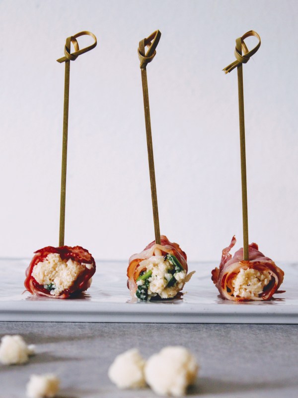 Snij de sneden spek in hun lengte doormidden en bak ze op een pan, zonder vetstof, langs beide kanten goudbruin. Giet er daarna een beetje honing over en leg ze open. Lepel een beetje bloemkoolcouscous op het uiteinde van elke snede spek en rol ze op. Serveer ze met een prikkertje en tast toe!