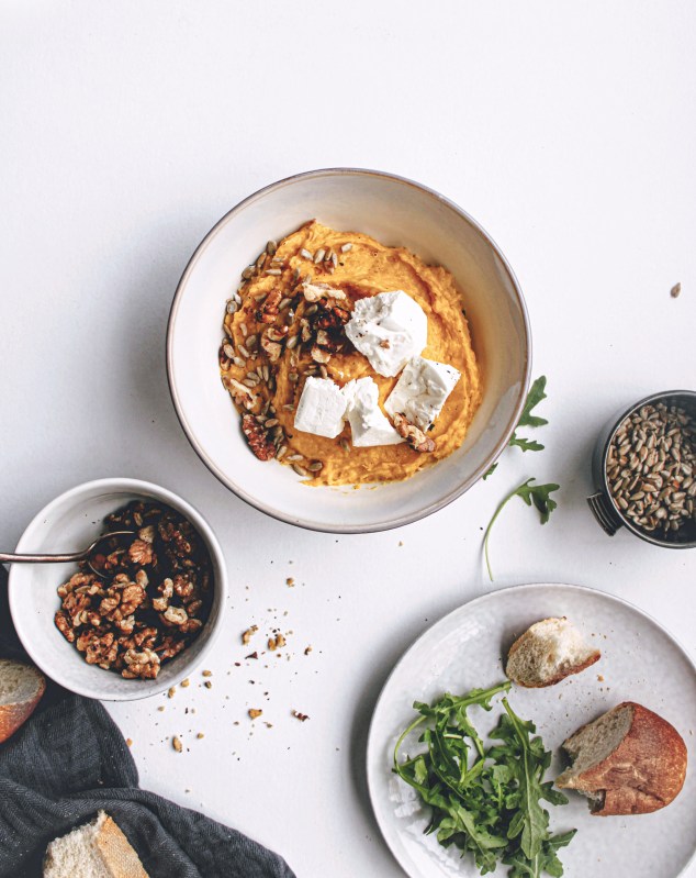 Serveer de butternutpuree in twee diepe borden, verbrokkel er het stuk fetakaas over, leg er de geroosterde walnoten en zonnebloempitten op en tast toe met een stukje brood en rucola. Voeg naar eigen smaak extra peper, zout of honing toe.