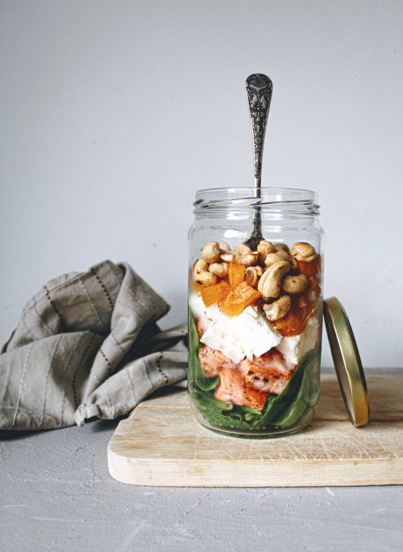 Begin nu met de laagjes in je glazen bokaal: jonge bladspinazie, zalm, fetakaas, pompoen en cashewnoten. YUM.