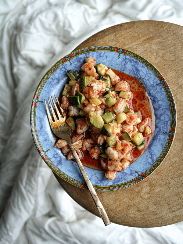 Verhit een pan en bak er scampi’s met de marinade gedurende een paar minuutjes op. Doe ze daarna bij de courgette, roer alles tot één geheel en serveer!