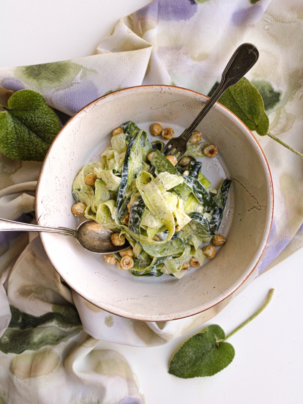 Schil met een dunschiller brede slierten van de courgette. Doe deze in in een mengschaal, voeg de Griekse yoghurt toe en giet er een scheut olijfolie bij. Snij de blanke hazelnoten grof en doe ze bij de pappardelle. Pers er één teentje look bij, kruid af met dille, peper en zout en meng alle ingrediënten onder mekaar. Ziezo, klaar!