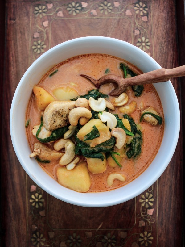Zet een grote kookpot op een laag vuurtje en doe er de currypasta in. Roer met een houten lepel de currypasta goed los en giet er het blik kokosmelk bij. Te moeilijk met een houten lepel? Gebruik dan een garde! Breng lichtjes aan de kook en roer er de bladspinazie onder. Voeg daarna de kippenblokjes, de aardappelblokjes en de cashewnoten toe. Voila, Thailand at home!