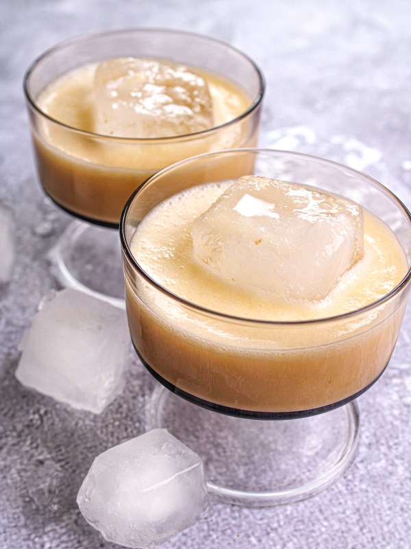 Leg ijsblokken in vier glaasjes en verdeel de piña colada. Done!